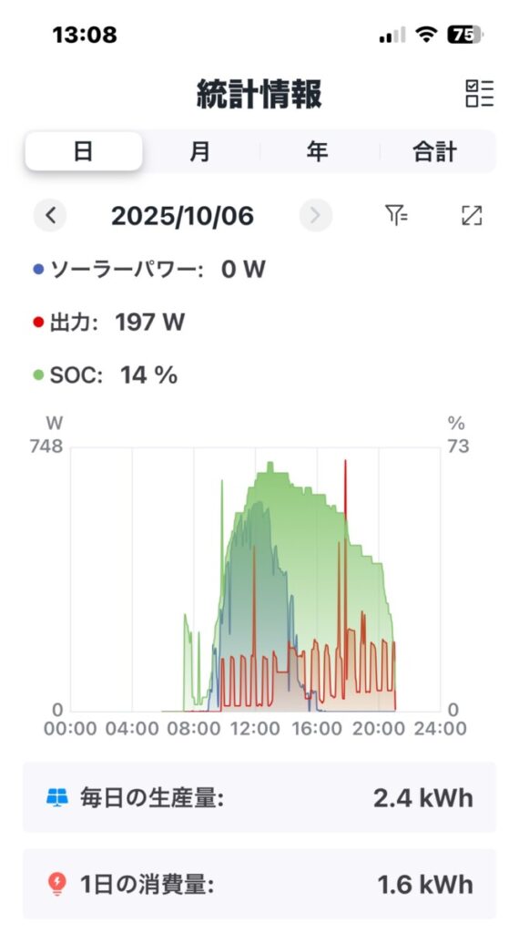 冷蔵庫の一部稼働以外はほぼ商用電力に依存した一日。