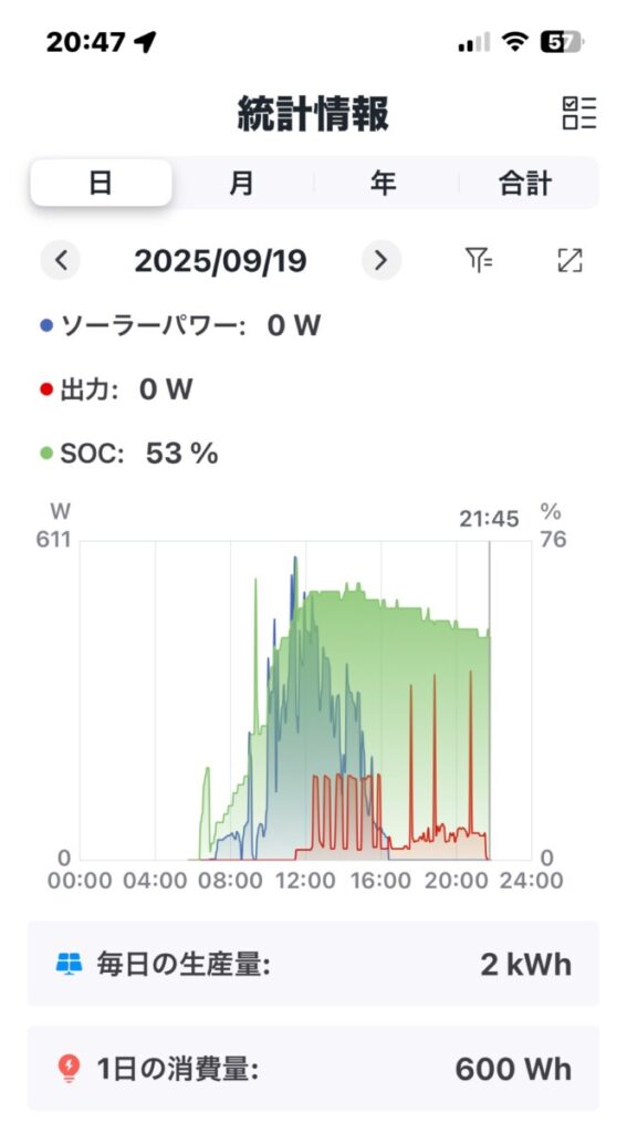 ただ、夕方以降は出力が落ち込み、🔋32%で冷蔵庫をDELTA 2 Maxに切り替えたものの、夜までには放電限界に到達。最終的に商用電力に切り替えとなった。