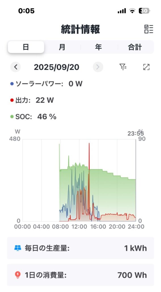 午前中は曇り気味で発電が伸びなかったが、11時台に373Wのピークを記録。その後は再び雲が厚くなり、出力が安定せず推移した。冷蔵庫は🔋45%時点でDELTA 2 Maxへ切り替えたが、夜には放電限界を迎えてしまった。