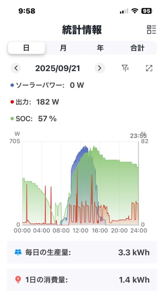 曇りスタートながら、日中は660W台の安定したピーク発電が確認できた。 ソーラーパネルの移動が功を奏してる。エコキュートを午前中のピーク発電に合わせて稼働させ、商用電力の依存を最小化。 午後はパネル直列から分離に切り替え、効率的にDELTAとHIを使い分け。 最終的に冷蔵庫をDELTAに委ねたが、夜間21:30に放電限界到達 → HIへ切替。 商用電力消費は約10kWhと高めだが、発電効率の改善とピーク活用がしっかり機能した一日。