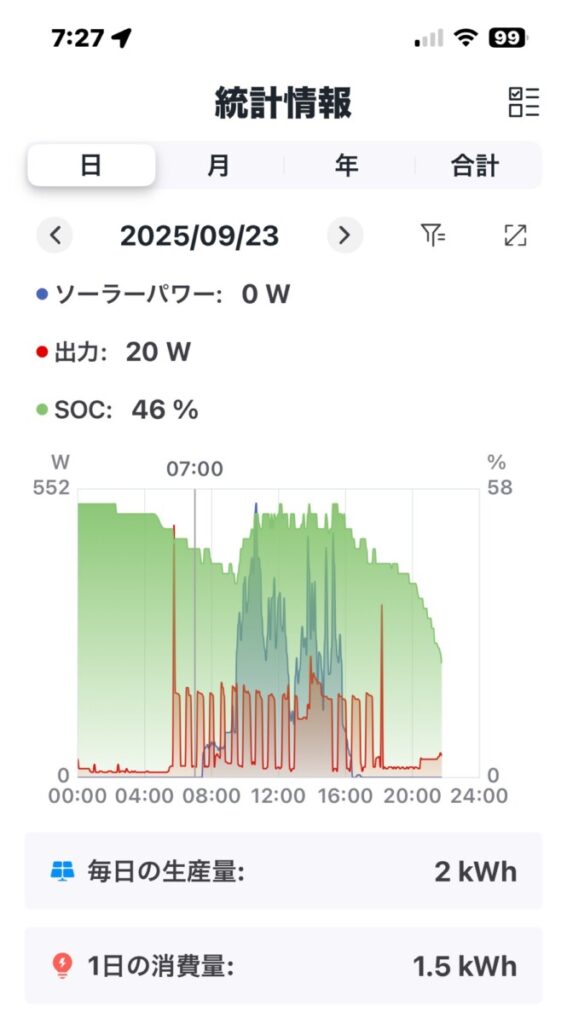 曇りの影響で全体的に発電は控えめ(2.28kWh)。 エコキュート稼働で商用電力消費は9.4kWhと大きめ。 日中の発電ピークは10時台〜13時台で300〜460W台。ただし厚い雲で安定せず。 DELTA 2 Maxは夕方までに35%まで回復し、冷蔵庫を任せられたのは収穫。 夜21:45には商用へ切替となったが、冷蔵庫をしばらく任せられる余裕ができた点は成果。