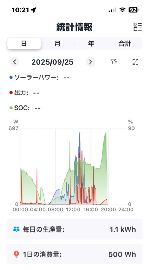 • 結果的に発電は1.22kWh止まりで、冷蔵庫やエコキュートなど生活の基盤は商用電力に頼る1日。
