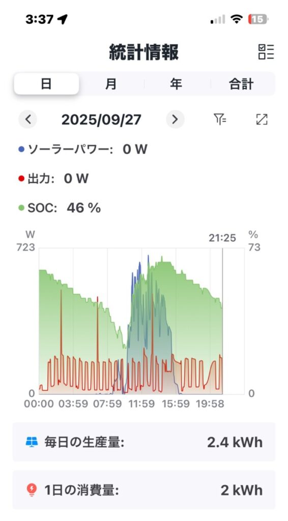 冷蔵庫の消費量が秋口に入って減少したことで、オフグリッドでの丸一日運用が可能に。
