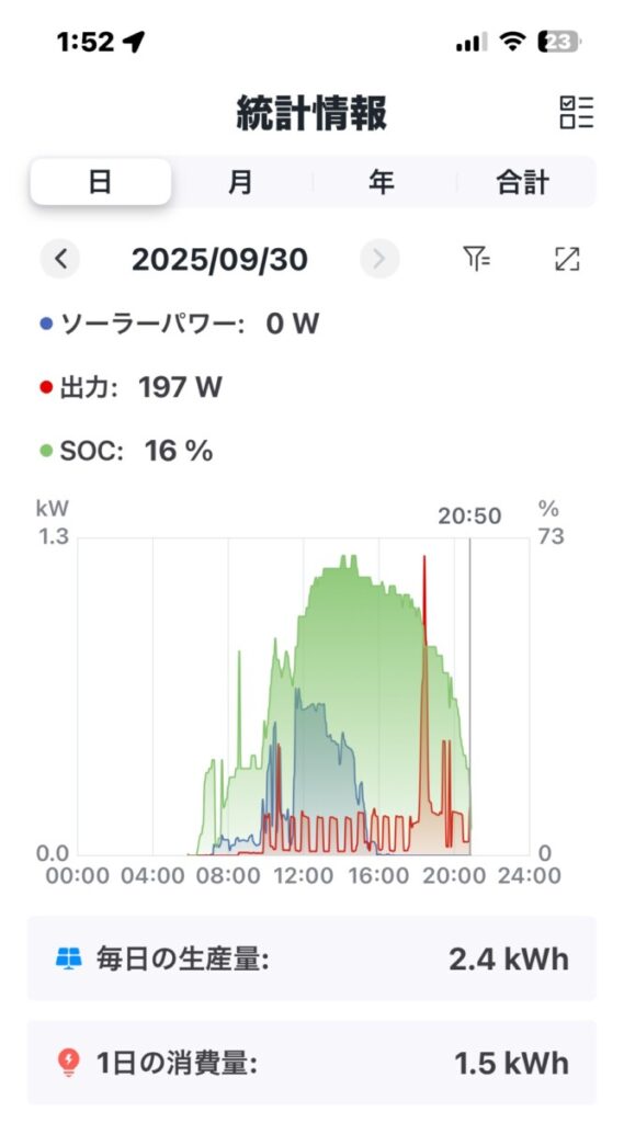 午前中は曇りで弱い発電が続いたが、昼前から急に雲が抜け、600〜680W台の安定した出力が得られた。午後も400W台を維持しつつ、夕方まで発電が継続。最終的に2.5kWhを確保。