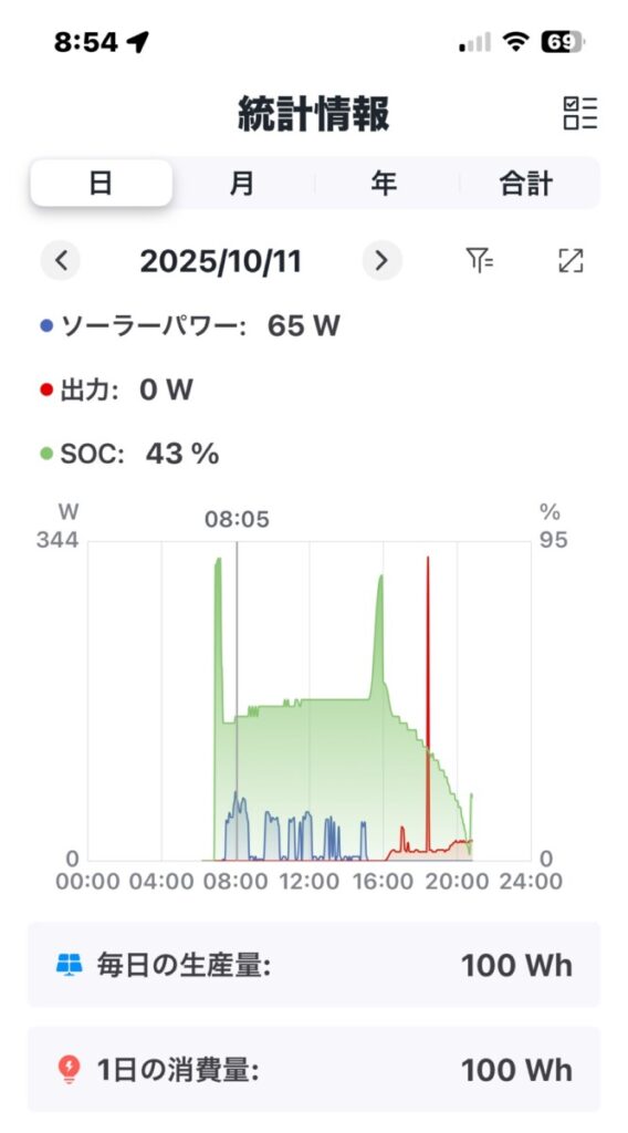 2025/10/11 オフグリッドジャーナル 天気🌧️ 発電量0.1kWh 商用電力 エコキュート5.4+家電2.2=7.6kWh