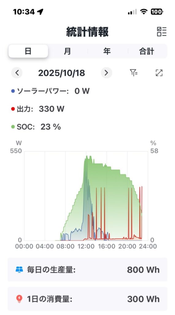 午後は曇天で発電が伸びず、夕方以降は蓄電も尽きて商用電力に切り替え。